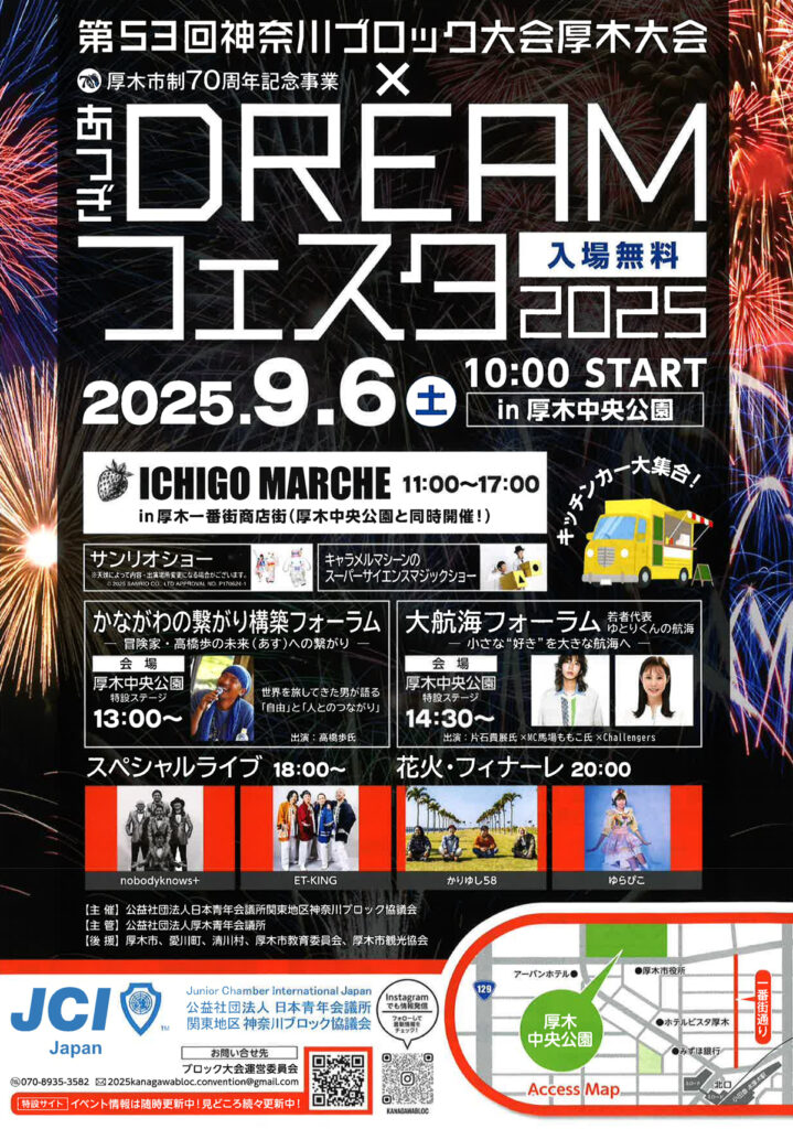 令和7年9月6日(土)厚木中央公園にて大規模イベント 厚木市制70周年記念事業「あつぎDREAMフェスタ」が開催されます。